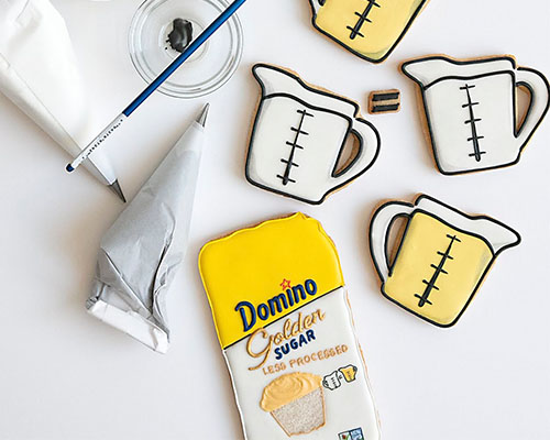 Put black icing, the consistency of toothpaste, in a piping bag fitted with a #1.5 tip. Outline the measuring cups including the curved line that defines the white sugar and Golden sugar levels in the cups. Add the measurement lines.
