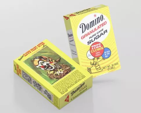 Additional colors and illustrations draw attention to this package, and a clown print giveaway was used to entice consumers to enjoy the products.