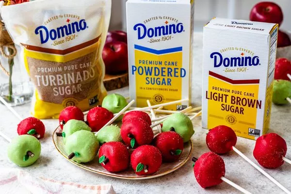 Immediately after dipping, place the pretzel on top to form the stem, and place the leaf right next to the stem. Sprinkle about 1/4 tsp of Domino® Turbinado Sugar on the apple, while the chocolate coating is still wet.