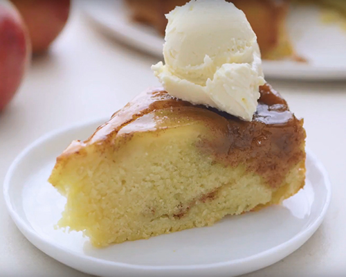 Add flour mixture to the wet ingredients alternating with the milk. Spoon the batter on top of the apples. Gently spread with an offset spatula to make an even layer.