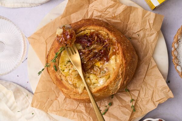 Preheat the oven to 400°F. Line a baking sheet with parchment.Cut the top off of the sourdough loaf, and hollow out a hole large enough for the wheel of cheese to fit in. The cheese should fit snugly and be even with the top of the bread. Set the cheese aside.