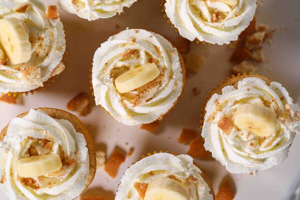 To assemble the cupcakes, use a cupcake corer or small paring knife to remove the center of each cupcake, then fill with about 2 teaspoons of chilled banana pudding. Transfer the whipped cream to a piping bag fitted with a 2D tip and pipe swirls on each cupcake. Garnish the cupcakes with banana slices and vanilla wafers.