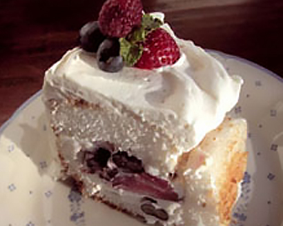 - Look for prepared angel food cake in the bakery section of your supermarket. Leftover angel food cake can be cut into small pieces and layered with pudding, mousse, fresh fruit or ice cream; or, make into crumbs and use as a topping.