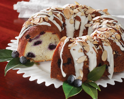 Add flour mixture to wet ingredients and mix on low speed. Stir in blueberries. Spoon into prepared bundt pan.