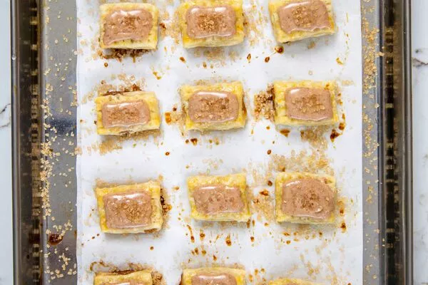 Place half of the rectangles about 1 inch apart on a baking sheet lined with parchment paper or a silicone baking mat. Brush the rectangles with an egg wash (1 large egg mixed with 2 tsp milk), then place a tsp of the brown sugar filling in the center of each rectangle. Place the remaining pastry dough rectangles on top of the filling and seal the edges of each little pop tart with a small fork.