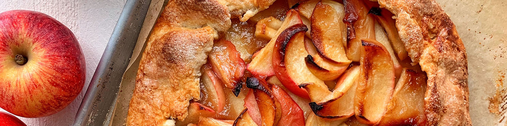 Assemble the galette: Preheat the oven to 400ºF. On a lightly floured surface, roll out the dough into an 18-inch circle, ⅙-inch thick. Transfer the dough over to a sheet of parchment paper and pile the apples in the center, leaving the outer 3-inches of dough bare.