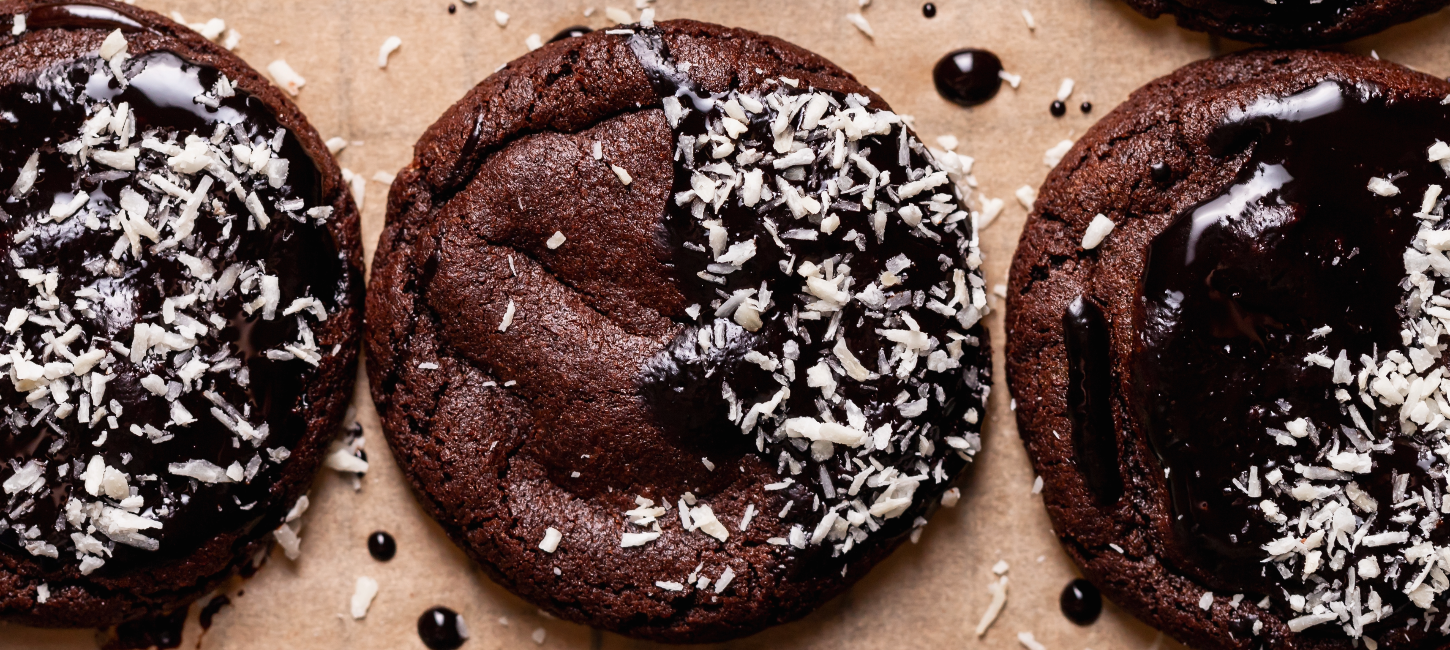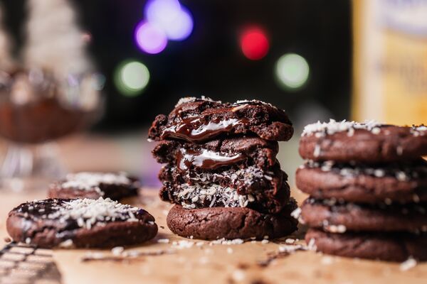Once completely cool, dip half of the top of the cookies (or the whole top) in the chocolate sauce then place them on a wire cooling rack. Let the syrup set for 5 minutes, then sprinkle with desiccated coconut. Enjoy!