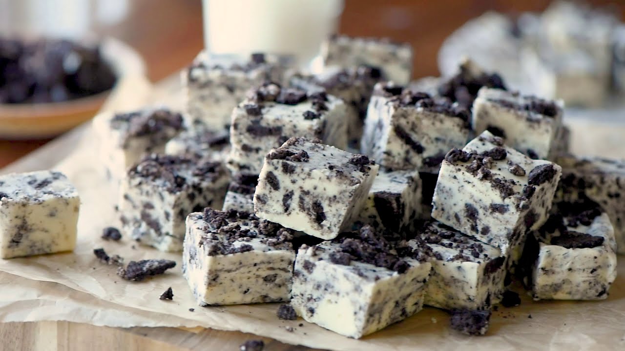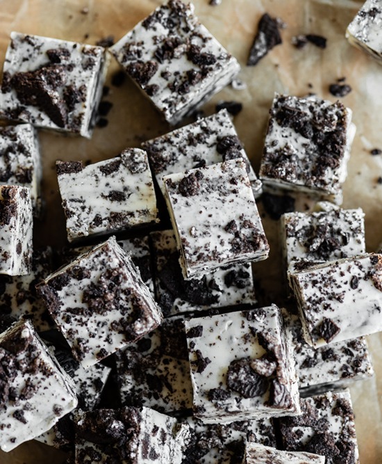 On a low-medium setting of your stand mixer, blend the fudge mixture until it is smooth and creamy. Using a spatula, fold in the crushed chocolate sandwich cookies.
