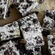 Pour the cookies and cream fudge mixture into the prepared 8 inch square pan. Even out the top, then top with additional crushed chocolate sandwich cookies (optional).