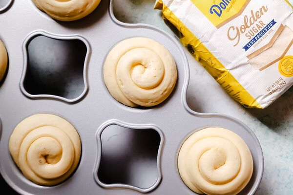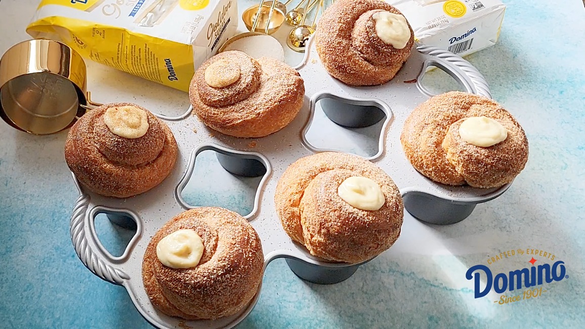 Preheat the oven to 375 F. Bake the proofed cruffins on the middle rack for 20-25 minutes until golden brown. Remove from the oven, carefully unmold using a fork or small off-set spatula. Roll the cruffins in the cinnamon Golden Sugar while they are still warm.