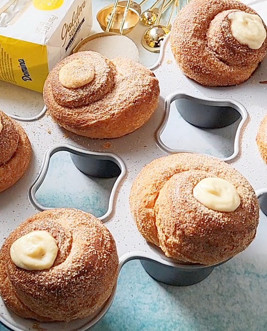Fill the piping bag with cooled Golden Pastry Cream. Pipe the pastry cream into each cruffin. Enjoy!