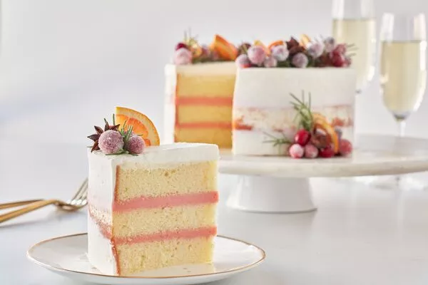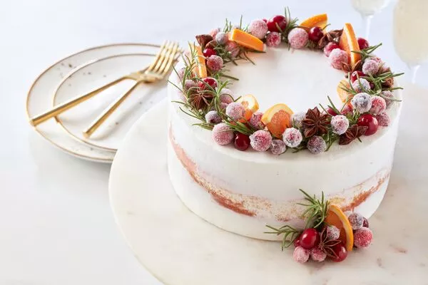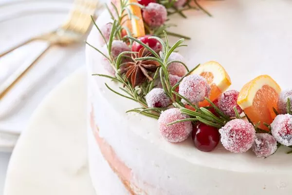 Once the cranberries are dry, decorate the cake with the sugared cranberries, fresh orange slices, and fresh rosemary sprigs.