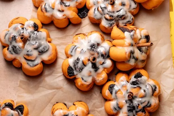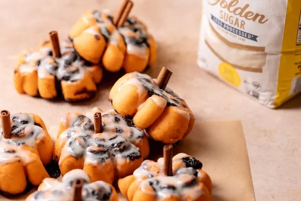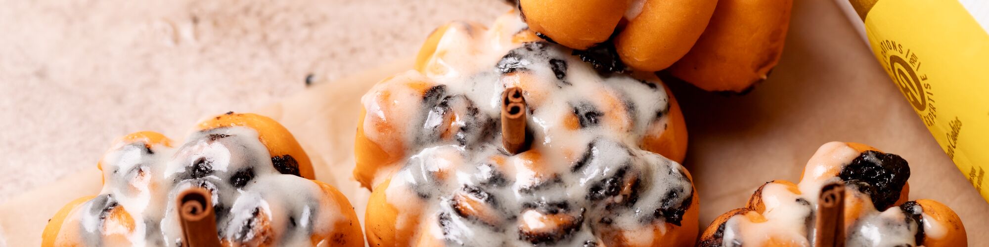 To make the frosting, cream together the softened cream cheese and butter. Then mix in the powdered sugar. Once combined, whisk in the cream until smooth. Spread over the cinnamon rolls, then insert a cinnamon stick into the top to be the “stem” of the pumpkin. Enjoy!