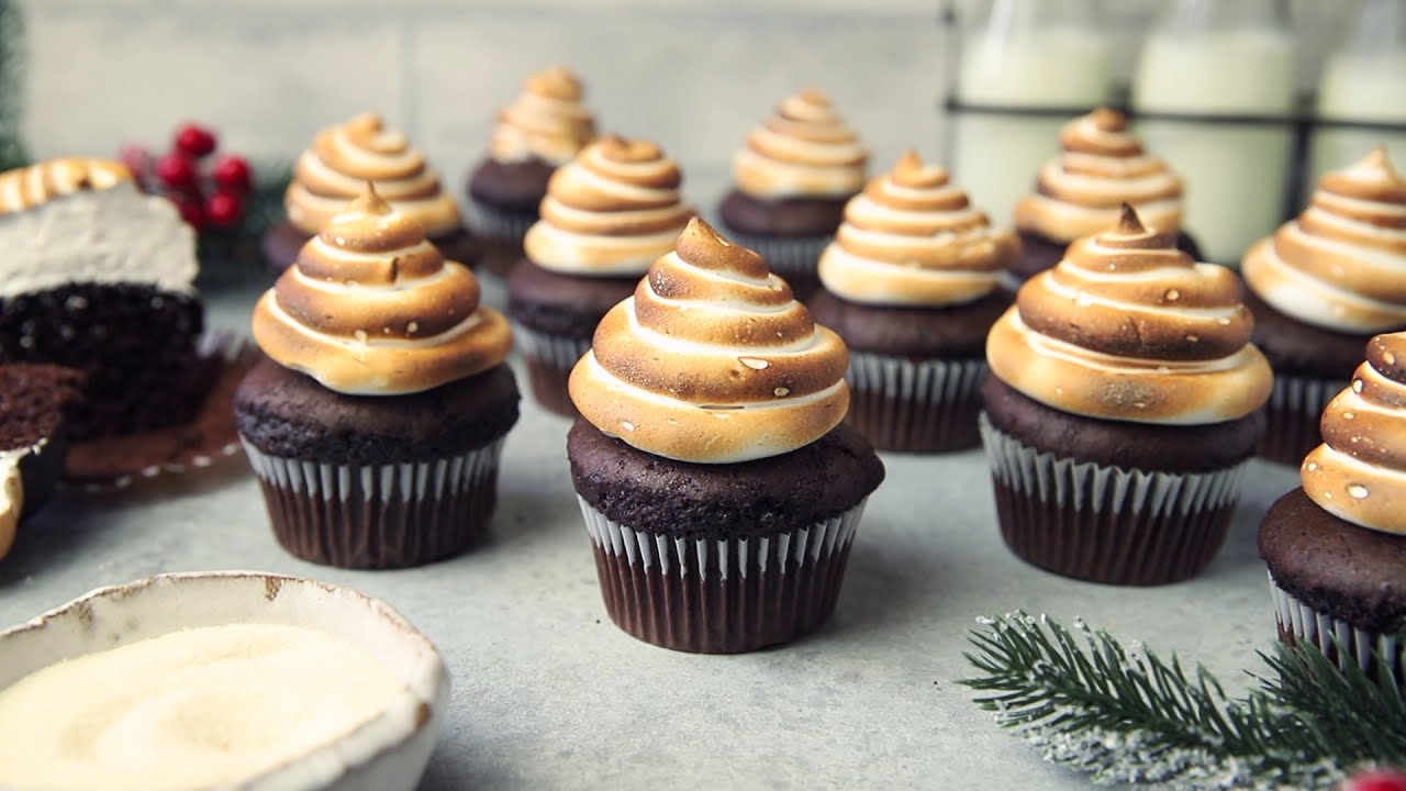 Transfer meringue to a piping bag and pipe onto cooled brownie cupcakes using a large round open tip. If desired, use a kitchen torch to toast.