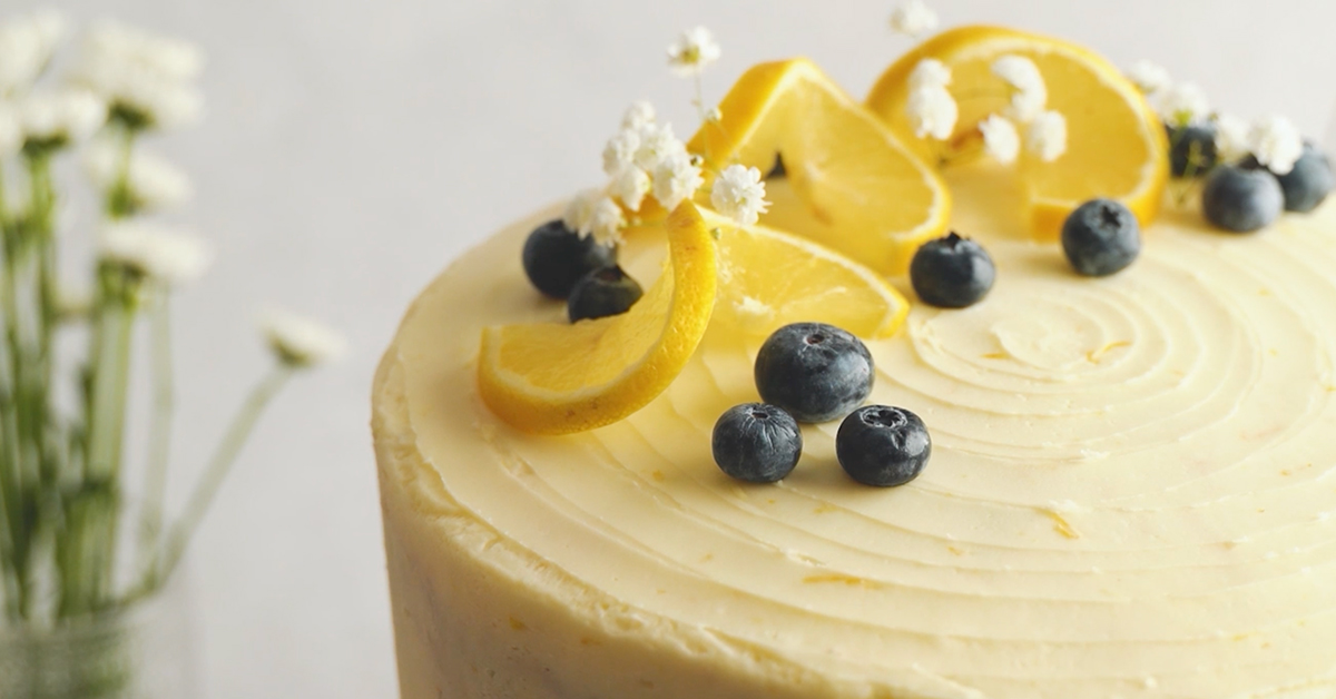 Add fresh blueberries and slices of lemon on top of the cake as decoration.