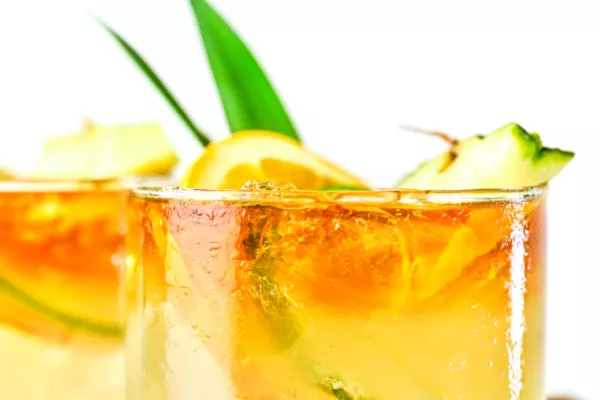 Pour mixture into two glasses filled with ice. Float the dark rum slowly pouring over the ice. Garnish.