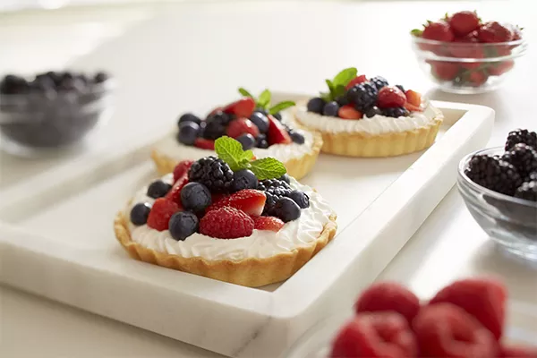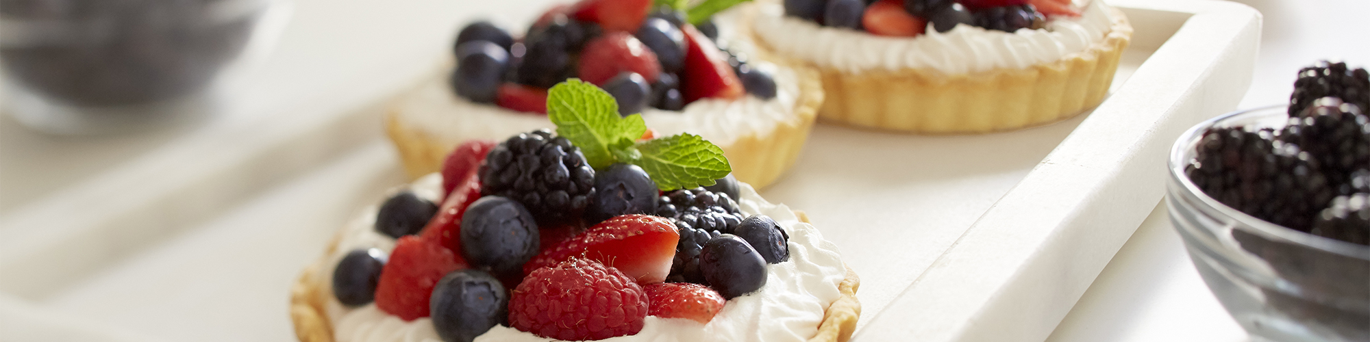 Use a piping bag with a fluted tip of choice to pipe chilled whipped cream around the perimeter of the tart(s). Decoratively arrange fruit on top of Golden Pastry Cream and around the whipped cream. Chill until ready to serve.