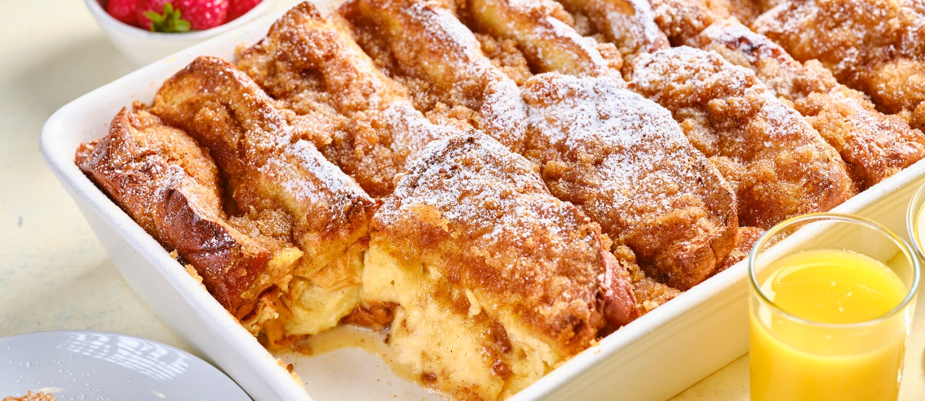 When ready to bake, preheat oven to 325°F. Combine the ingredients for the topping and spread on top of the brioche slices. Bake for 40-45 minutes or until golden brown. Remove from the oven and serve immediately. Sprinkle powdered sugar as decoration.