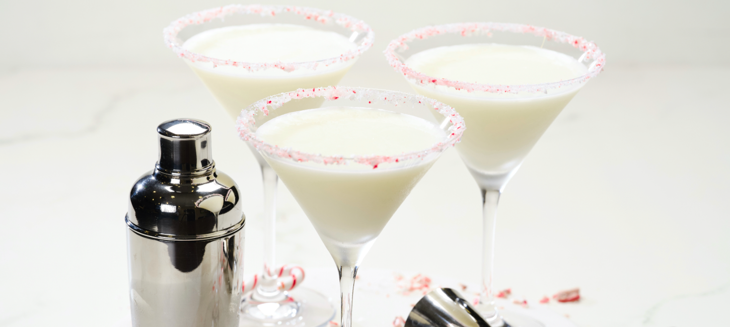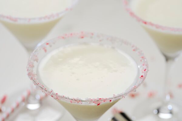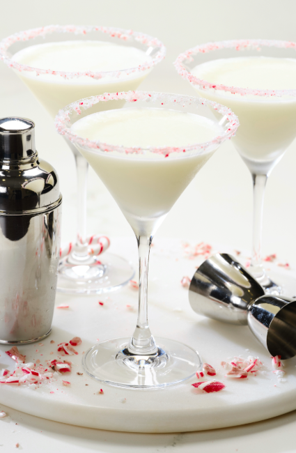 Pour 2 tablespoons of simple syrup on a shallow dish. Combine crushed candy canes and sugar on another shallow dish. Dip rims of two martini glasses in the simple syrup and then in the candy cane mixture.