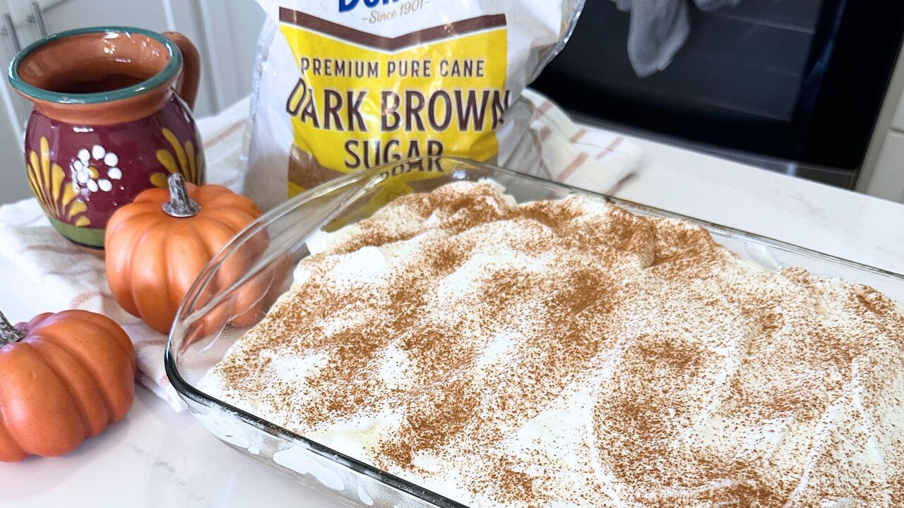 Spread or pipe the whipped cream topping across the cake and dust with ground cinnamon powder. Slice the cake into squares, serve, and enjoy!