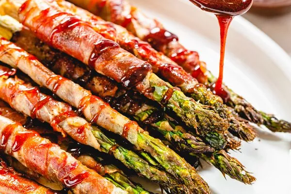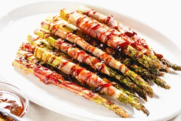 While the asparagus are baking, prepare the glaze. In a small saucepan, at medium heat, combine the balsamic vinegar and sugar until reduced to half. Drizzle over asparagus and serve immediately.