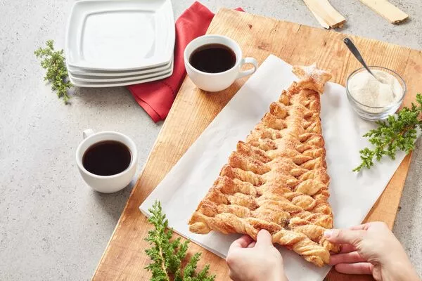 Place the other sheet of puff pastry on top. Cut slits on both sides of the tree. Twist each strip of puff pastry. With the leftover dough, cut star and place on top of the tree. Brush the tree with melted butter and sprinkle some sugar-cinnamon mixture on top.