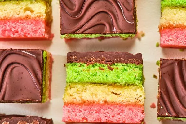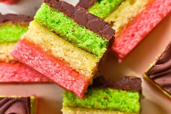 With the cake still on the pan, spread apricot jam on top of the green cake. Flip the white layer cake on top. Remove parchment paper. Spread raspberry jam over the cake. Flip the red cake on top. Do not remove the parchment paper just yet. Cover with plastic wrap. Place one baking sheet on top of the cake. Weigh down the pan with cans and refrigerate for 4 hours or overnight.