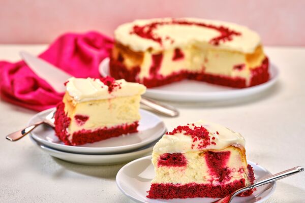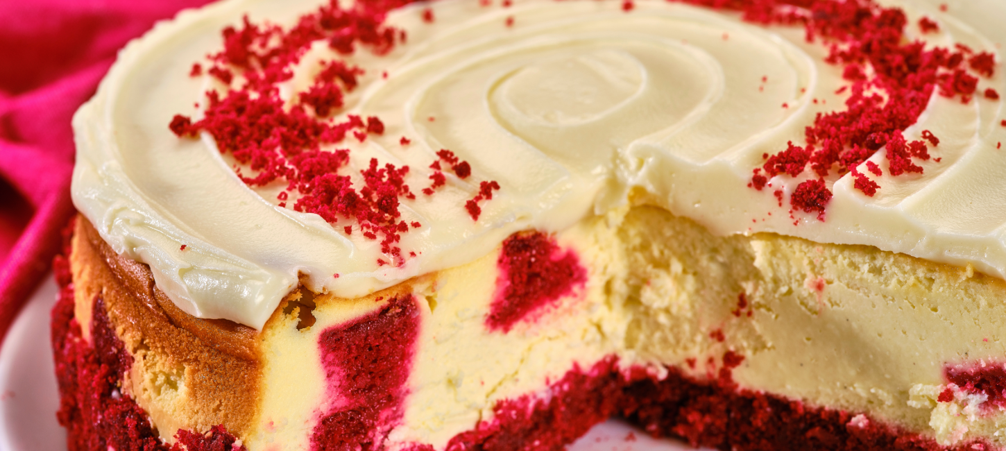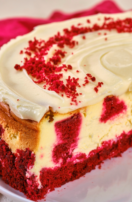 Wrap the springform pan with aluminum foil and place in a large roasting pan. Take the pieces of cake out of the freezer and place half at the bottom of the cheesecake. Pour half of the cream cheese mixture into the pan. Repeat the process with the rest of the cake pieces and the cheesecake batter. Place roasting pan in the oven and add hot water to come up 1-inch of the springform pan. Bake for 1 hour and 10 minutes or until the cake looks set in the center. Carefully remove from oven and allow resting for 1 hour. Refrigerate in the pan for at least 6 hours or overnight.