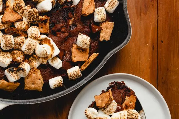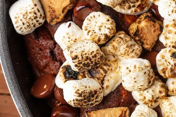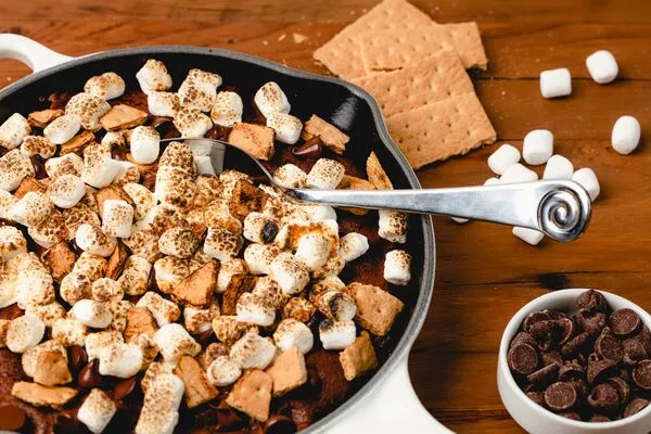 Pour mixture into an 8-inch skillet. Top with remaining mini marshmallows, chocolate chips, and graham crackers. Grill or bake for 10-12 minutes. Remove from grill. Allow 10 minutes for cooling and serve.