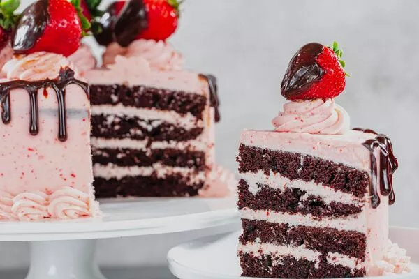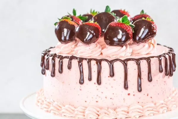 Assemble the cake. Using a large serrated knife cut both cakes horizontally as even as possible. Using both hands, place one layer of cake on a serving platter. Pipe frosting on top of the cake. Place another layer of cake and repeat the process. Finish the cake by icing top and sides with frosting. Heat up the hot fudge topping according to manufacturer’s instructions. Dip the strawberries in the hot fudge and set aside. Add the rest of the hot fudge to a pipping bag and decorate the cake creating a dripping effect. Pipe buttercream roses on top of the cake and place the chocolate covered strawberries on top. Serve.