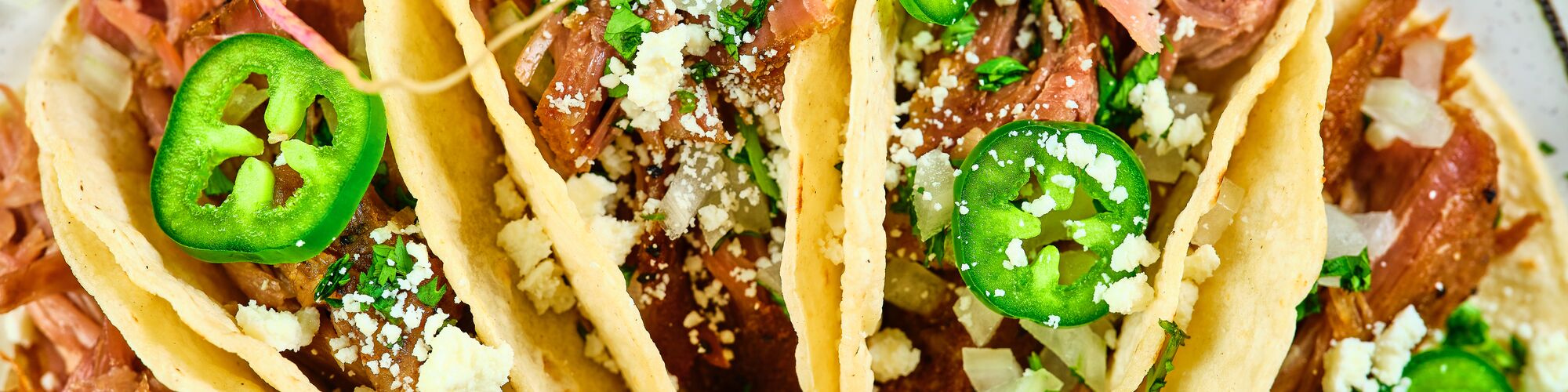 Prepara los tacos. Calienta las tortillas y coloca un trozo de carnitas encima. Agrega las cebollas en escabeche, cilantro, jalapeños y queso. Sirve de inmediato.