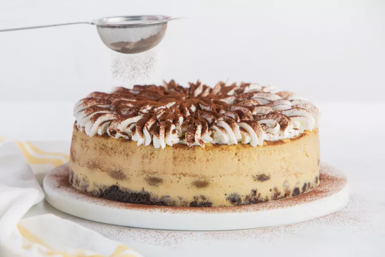 When ready to serve, carefully remove the cheesecake from the pan. Beat heavy cream until it becomes thick. Add powdered sugar and vanilla. Beat at medium speed until soft peaks. Top the cheesecake with whipped cream. Dust with cocoa powder and serve.