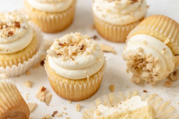 Pipe a swirl of buttercream around each cooled cupcake. Use the back of a spoon to make a small cavity indentation on the top. Sprinkle almond crumble generously over the top.