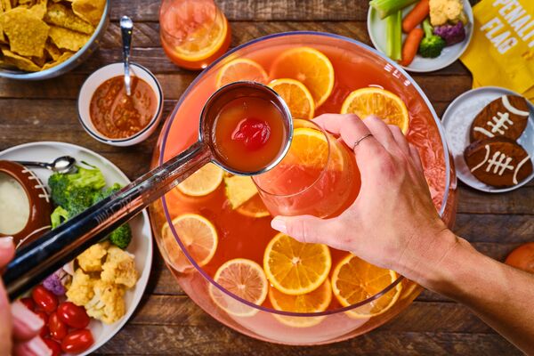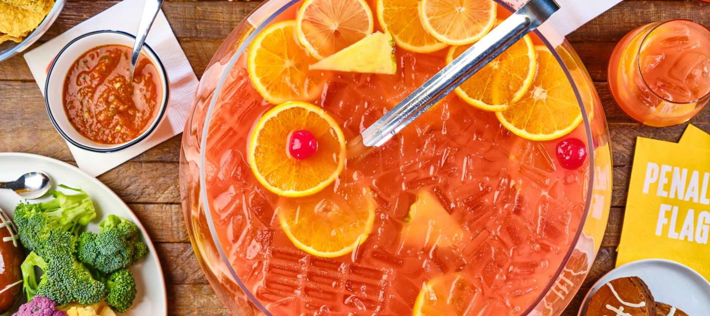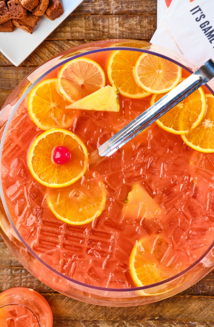In a punch bowl, combine all the ingredients for the punch. Add ice and garnish with fruit. Serve immediately.