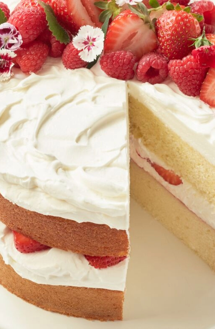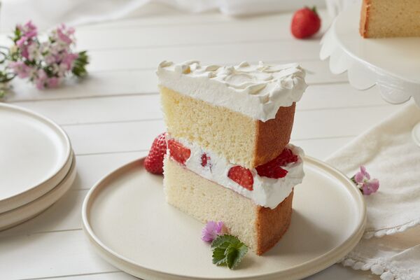 Transfer one cake to a serving platter; evenly spread the jam on top of the cake. Dollop half of the cream on top of the jam. Top with the remaining cake. Dollop with cream, add fresh strawberries and dust with powdered sugar. Serve immediately.