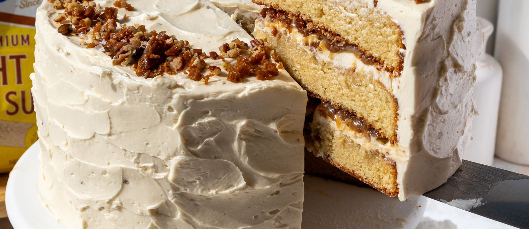 - Spread an even layer of butterscotch buttercream on top of the first cake layer. Drizzle about 1/2 cup of the butterscotch sauce on top of the frosting, then sprinkle on a few spoonfuls of the toffee bits and toasted pecans. Repeat this process with the remaining cake layers.