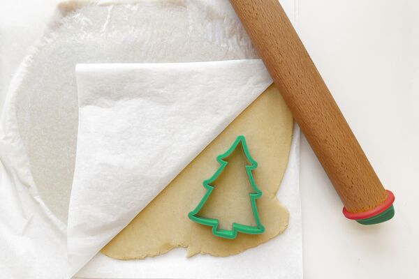 Long gone are the days of chilling your dough for hours, whacking it with a rolling pin to get it to flatten, and adding tons of flour to your pants dough in the process. Instead, separate your finished dough into two large chunks, flatten one with the heel of your hand on top of a sheet of parchment paper, then cover with another piece of parchment paper. Finish by rolling it to your desired thickness with a rolling pin.