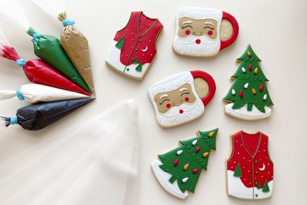 Tipless bags are the best! I love that you don’t have to purchase a huge stock of tips and couplers to dive into decorating and they make cleanup a breeze. They’re also great for fine details. To cut tipless piping bags, hold the bag with the seam facing up and cut a small line across the tip. I like using sewing scissors for this. If you have to pause your cookie decorating for any reason, pop the icing bags straight into your freezer to keep your icing from separating. Let thaw on the counter for about 30 minutes and then they’re ready to go!